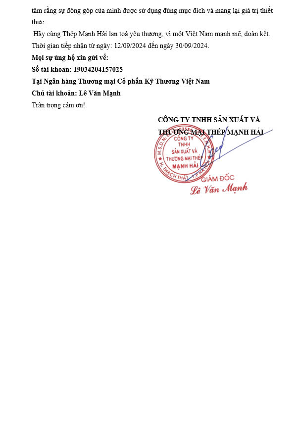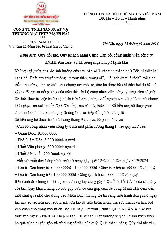 Bên cạnh đó chúng tôi kêu gọi sự chung tay cùng gây " QUỸ NHÂN ÁI" của các Quý đối tác, Qúy khách hàng có sức góp sức, có của góp của, để cùng Mạnh Hải đem đến một chút quà nhỏ cho đồng bào Miền Bắc. Chúng tôi tin rằng mỗi hành động nhỏ ngay lúc này sẽ tạo nên một sức mạnh lớn lao để tiếp thêm niềm tin, sức mạnh và làm bớt khó khăn cho đồng bào miền Bắc lúc này. Chương Trình " QUỸ NHÂN ÁI" sẽ kết thúc vào ngày 30/9/2024 Thép Mạnh Hải sẽ cập nhật thường xuyên , minh bạch toàn bộ quá trình quyên góp và sử dụng số tiền của quỹ. Quý khách hàng, Qúy đối tác yên tâm rằng sự đóng góp của mình được sử dụng đúng mục đích và mang lại giá trị thiết thực.
