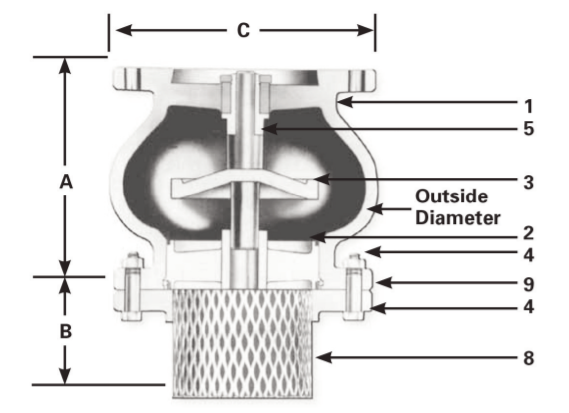 Van hút được cấu tạo từ 6 bộ phận chính, đó là: thân van, đĩa van, trục van, lò xo, lưới lọc và đầu kết nối.